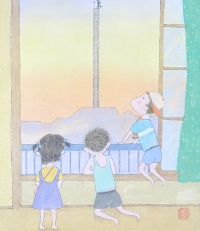子どもたちは山道を上へ上へとのぼりたがる。ボクも子どもの頃、村はずれにある山の上から遠くの風景を眺めるのが好きだった。習性なのかもしれない。こどもたちは階段をのぼって四畳半の教室に入るなり「こんにちは」といって、つっ立ったまま、手すりにからだをあずけて窓の下をのぞきこむ。つられてボクものぞいてみることがある。そこには、むかし東京の下町の長屋と呼んでいた風景が、そのまんま残っている。窓から見下ろすと左右に細長い屋根の二棟が向き合って建ち、間に道のような庭のような空間があり、ギコギコ井戸水をくみ上げる手押しのポンプも見える。ボクは音がしても下をのぞき込むことはしたくなかったけど、ただ遠くを眺めるのは好きだった。二方の窓は北と西にあり、西の窓からの景色は高い建物がほとんどなく広々とした眺めだった。西北の角には近くの銭湯の煙突が際立ってみえ、モクモクと立ちのぼる煙の色は、はじめはうすく、少し黄色がかった灰色で、しばらくすると黒ずんだ色に変わり、うねるように勢いよく、えのぐをチューブから押し出す瞬間にも似て、まるで生きもののようにも見える。そして日によって煙の色は微妙にうすくなったりもする。「燃やすモノによってちがうのかなア」とつぶやきながら子どもといっしょに見つめるのだった。